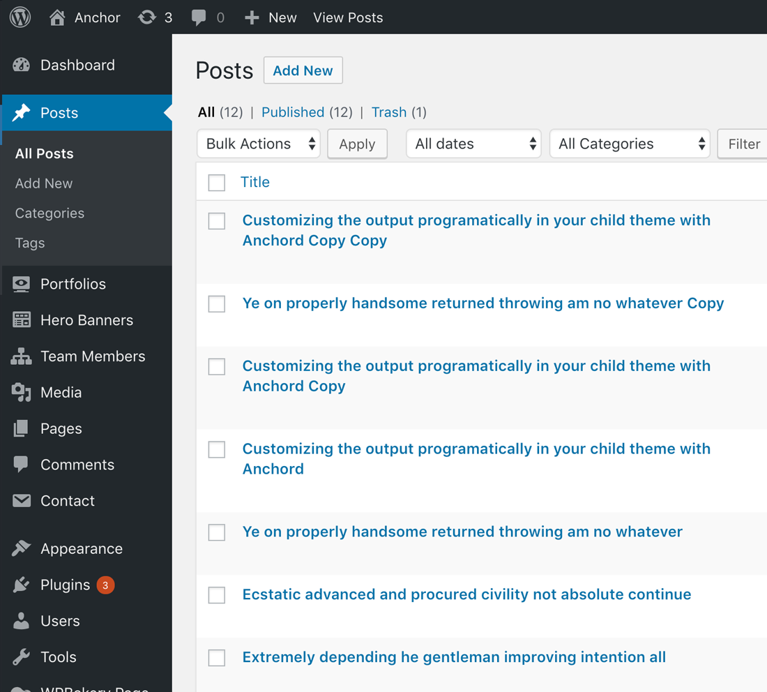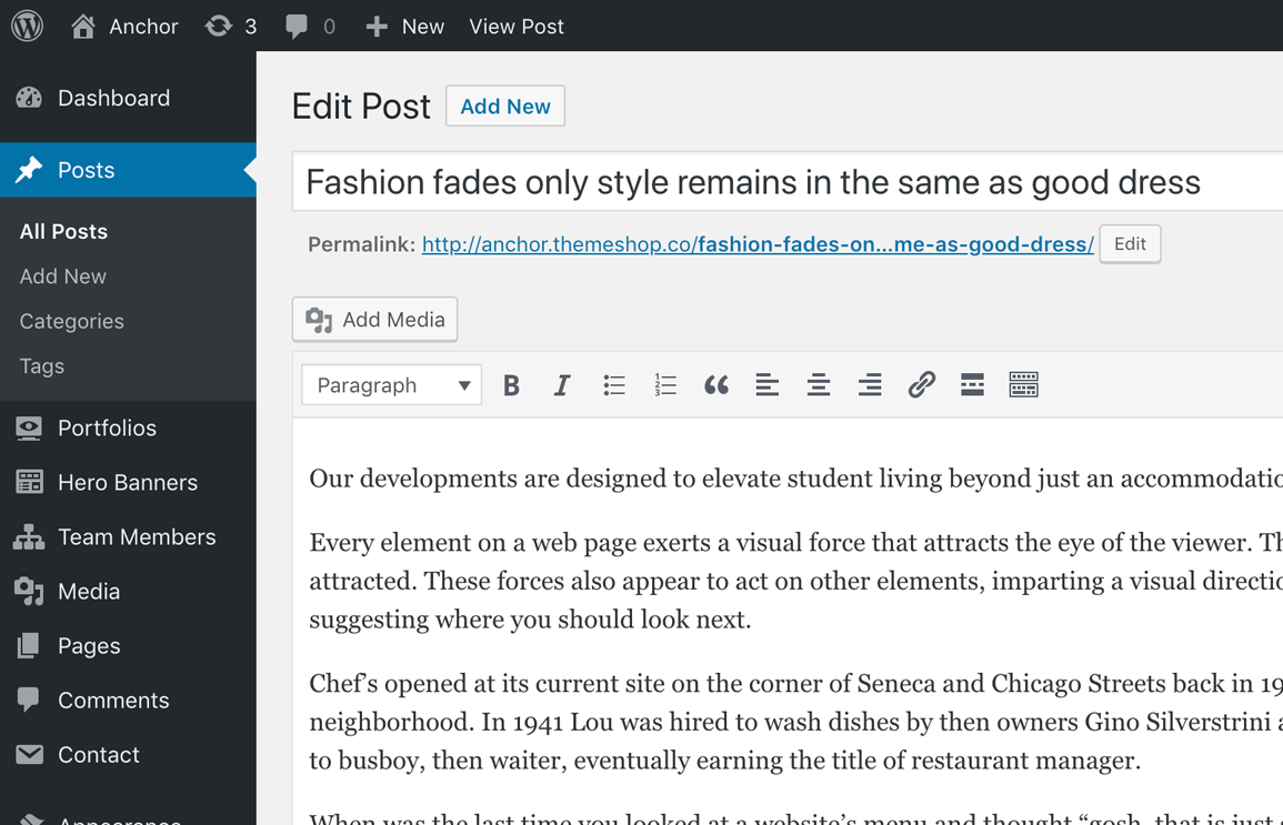 Step 2 – Click on Add New to make a new post. Create a title and insert your post content in the editing field. You can use any of our short code Unicord elements inside the post.